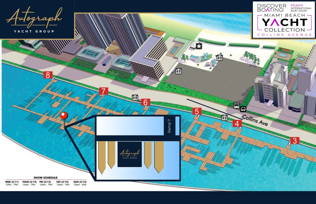 Autograph Yacht Group will be exhibiting at the Miami Beach Yacht Collection location on Collins Avenue at the end of Ramp 7, a prime waterfront setting offering easy access, nearby parking, and a relaxed atmosphere for exploring yachts on the water. This location provides an ideal environment for showgoers to connect with brokers, view vessels up close, and enjoy a more efficient and enjoyable boat show experience.